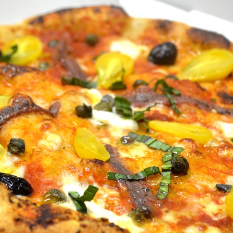 Thon, anchois, sauce tomate maison, tomates jaunes, olives noires, câpres, mozzarella Herbes fraiches.