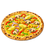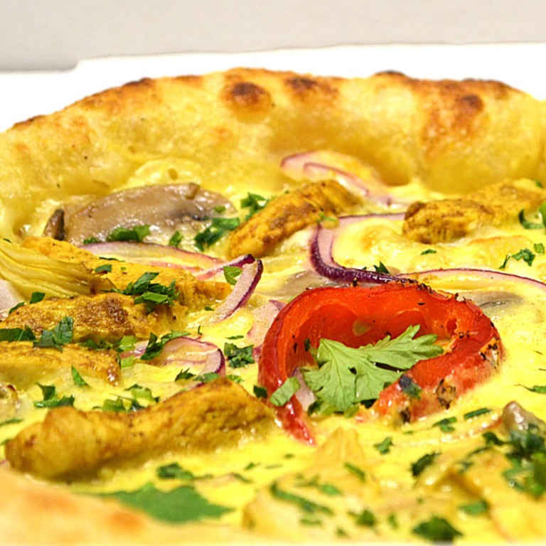 Poulet grillé, sauce curry, poivrons rouges, coriandre, artichaut, oignons rouges, champignons.