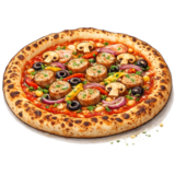 Une pizza gourmande entre mer et légumes. Pizza sauce tomate garnie de crevettes, moules, mozzarella, tomates séchées, poivrons, champignons et aneth.