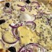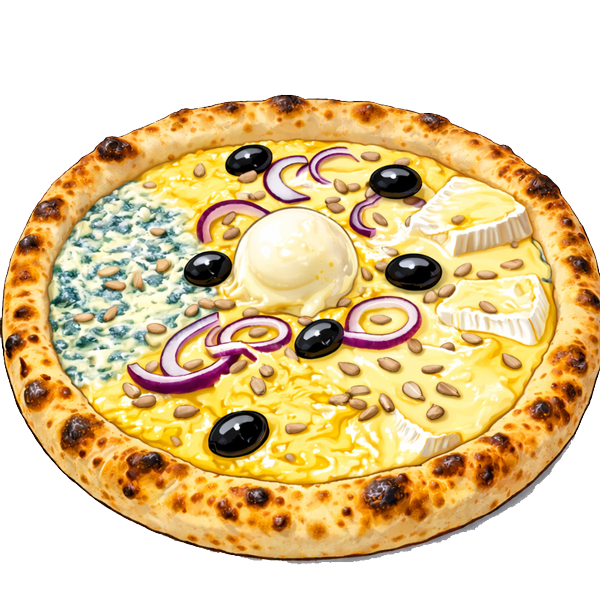 Alliance fondue de bleu affiné, tomme de brebis et camembert crémeux, surmontée d’un cœur de mozzarella fondante, oignons rouges et olives noires pour l’équilibre.