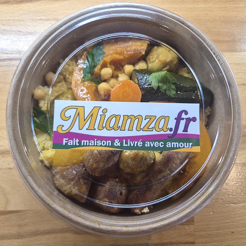 Semoule de couscous, choux, potimarron, navets, carottes, oignons, pois chiches, bouillon épicé, brochette de veau, saucisse de veau maison, huile d’olive, épices douces, herbes fraîches.