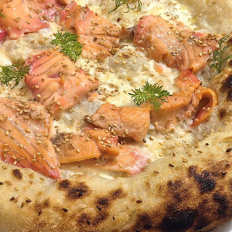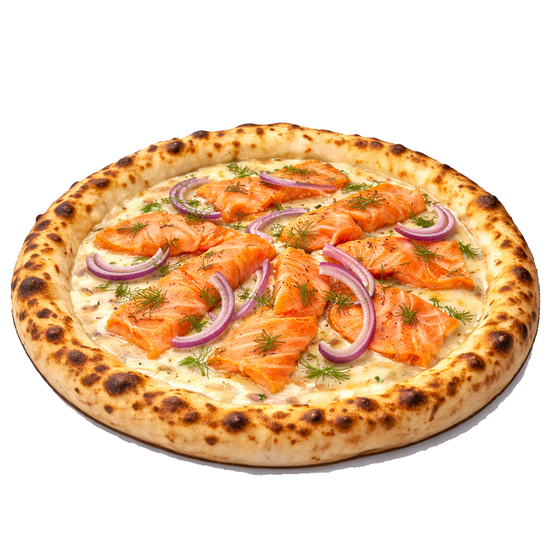 Une création fraîche et élégante sur base blanche, relevée par une pointe de citron et de citron confit. Le saumon fumé maison apporte une profondeur aromatique délicate, équilibrée par la vivacité des oignons rouges et la fraîcheur des herbes fraîches. Une pizza fine, lumineuse et raffinée, pensée pour mettre en valeur le travail artisanal du saumon fumé maison.