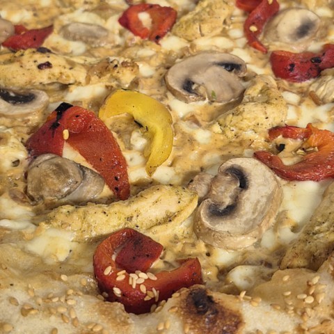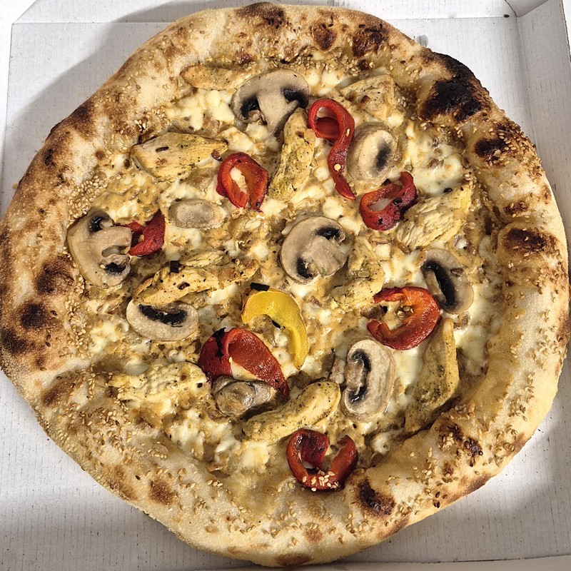 Poulet rôti sur base blanche, relevé d’un curry léger, poivron, champignons et herbes fraîches.