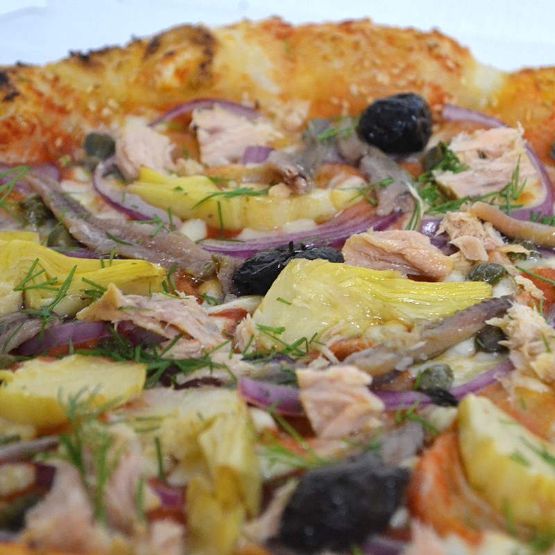 Base tomate, thon de Bretagne, anchois, câpres, artichauts (cœurs ou quartiers), Mozzarella, olives noires, oignons rouges, herbes fraîches.