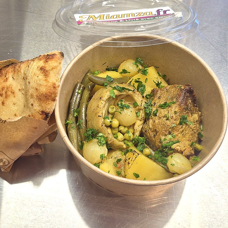 Mijoté de veau aux épices douces, légumes fondants et jus savoureux. Artichauts, petits pois, pommes de terre et oignons grelots. Servi chaud dans un bowl, avec pain maison et couverts fournis.